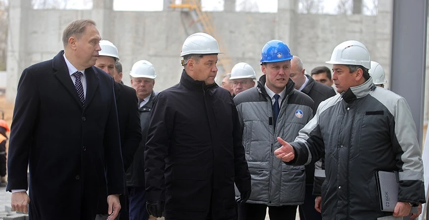 Ноябрь 2022 года, премьер-министр Роман Головченко (второй слева) посетил строящееся производство стеклотары в Гродно. Источник: belta.by