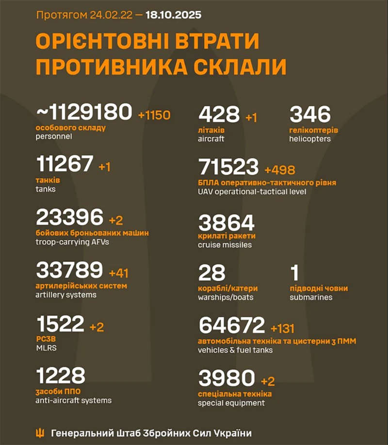 В ночь на 18 октября российские войска запустили 164 ударных беспилотника типов Shahed, «Гербера» и других моделей, а также три ракеты С-300 из Курской области РФ, сообщают Воздушные силы ВСУ.